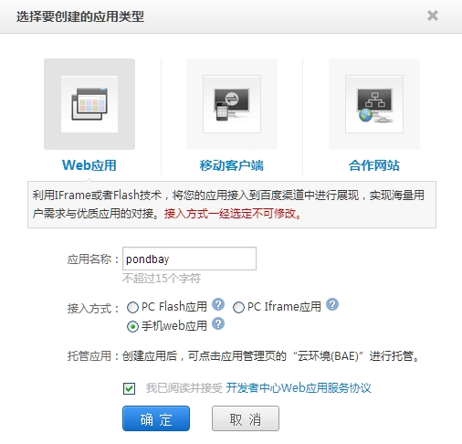 应用名称自己随便填写一个,接入方式选择“手机web应用”,然后点击确定。